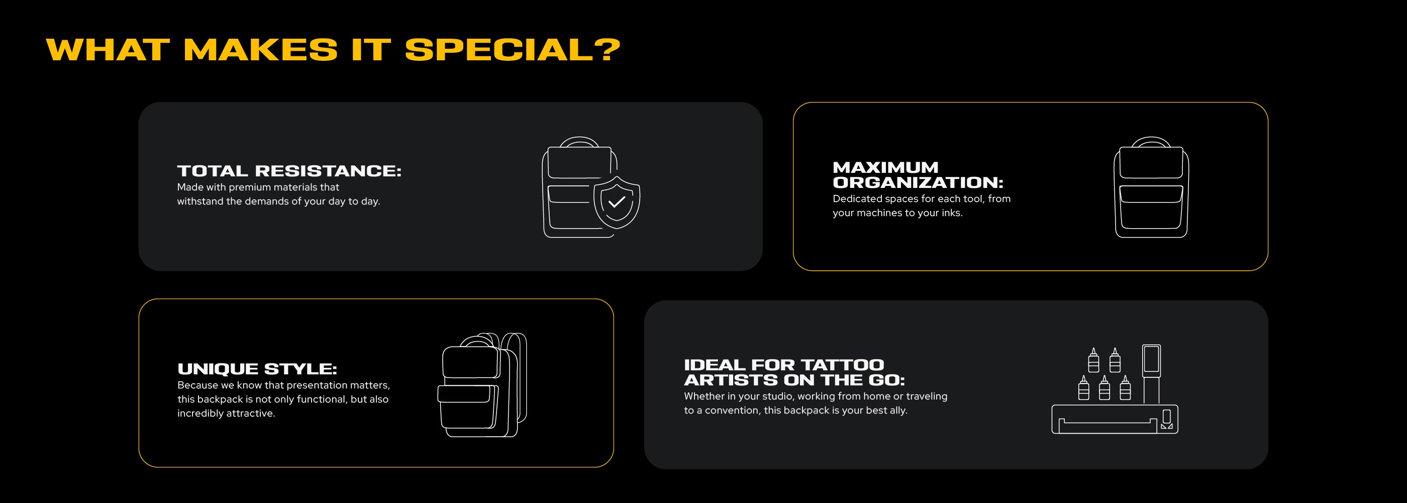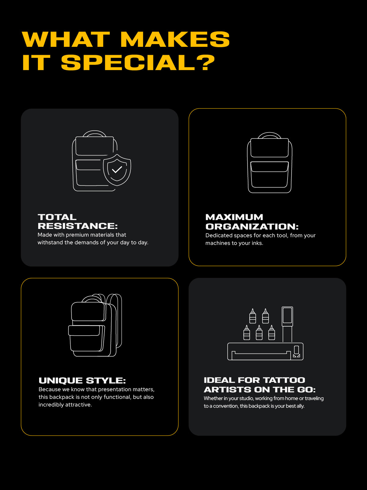 The FURY backpack is designed with durable, water-resistant materials, making it the ideal travel companion for tattoo artists on photoshoots, daily commutes, or spontaneous adventures.